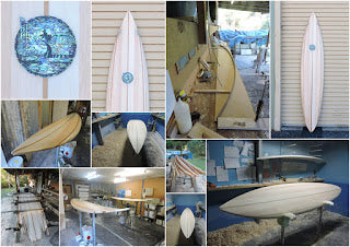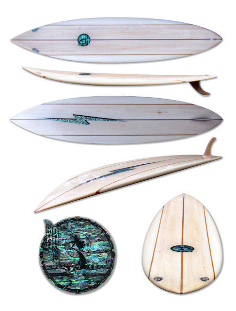 In tribute to classic guitars, I finish my balsa boards with inlayed Mother of Pearl logos . These are my lasting works of art in the surfing world and will be around for generations, to become treasured family heirlooms.