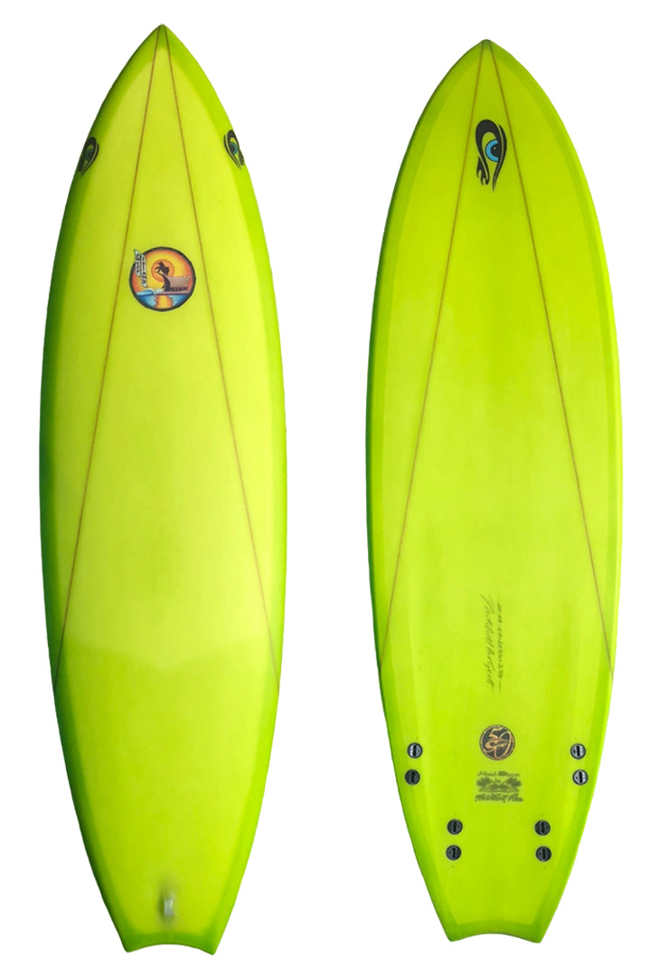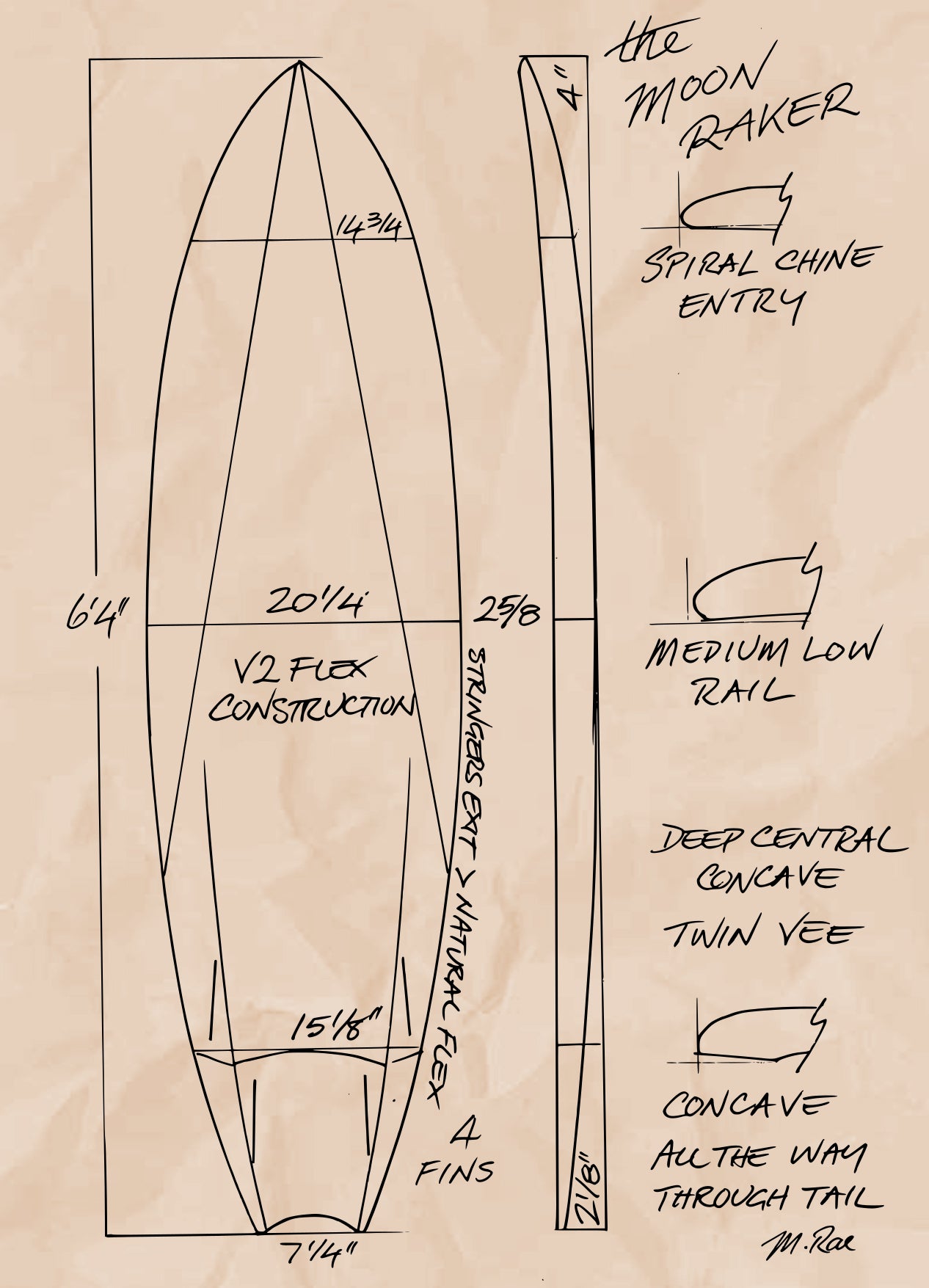 Using the longer lines of a 7'4 pintail gun, I then 4'' cut from the nose to shorten overall length while holding the long projection lines. The Moonraker has low entry rocker with a parabolic, progressive speed-continuous curve throughout, mirrored and accentuated through the concave. Quick release rocket tail, fed by a deep single concave within defined twin narrow vee control planes loosen the design right up without sacrificing drive.